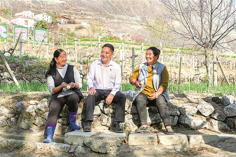 2023年3月,魏国权(中)在四川省甘孜藏族自治州得荣县瓦卡镇农田边了解惠农政策落实情况。(资料图片)