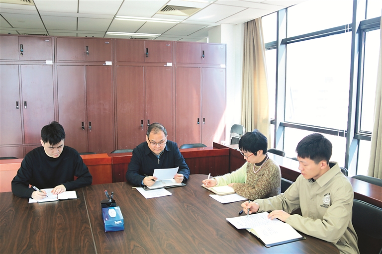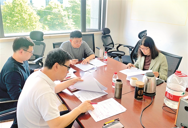 2022年5月,周莹(右一)与同志们一起研究梳理专案证据情况。(资料图片)