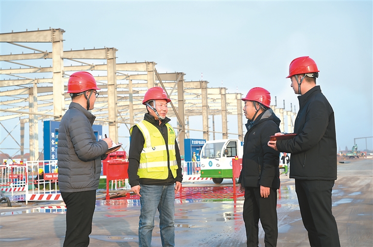 山东省胶州市纪委监委坚持系统观念,突出全链条压实责任、全方位延伸触角、全周期深化治理,将项目落地、政策落实、企业感受等情况作为护航上合示范区高质量发展的监督重点。图为该市纪检监察干部在山东高速上合经贸产业园项目现场了解项目建设进展情况。王炳慧 摄