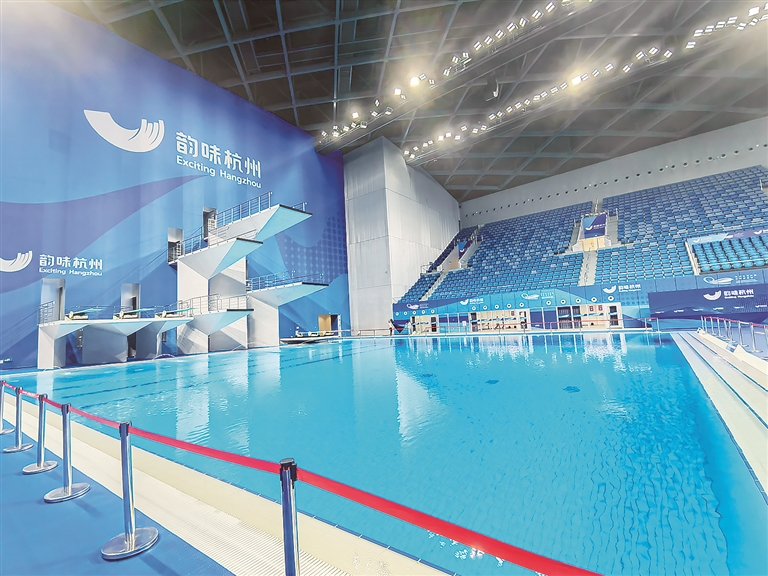 “化蝶”的另一翼,是拥有约6000个观众席位的杭州奥体中心游泳馆,作为游泳、跳水、花样游泳项目的比赛场馆及训练场馆,游泳馆内设有比赛池、跳水池、热身池等5个水池以及10米台、5米台、3米板、1米板等设施。