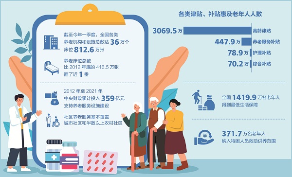 2012年至2021年,中央财政累计投入359亿元支持养老服务设施建设,社区养老服务基本覆盖城市社区和半数以上农村社区,居家社区机构相协调、医养康养相结合的养老服务体系持续健全。高龄津贴、养老服务补贴、护理补贴、综合补贴分别惠及3069.5万、447.9万、78.9万、70.2万老年人。全国1419.9万名老年人得到最低生活保障,371.7万名老年人纳入特困人员救助供养范围。