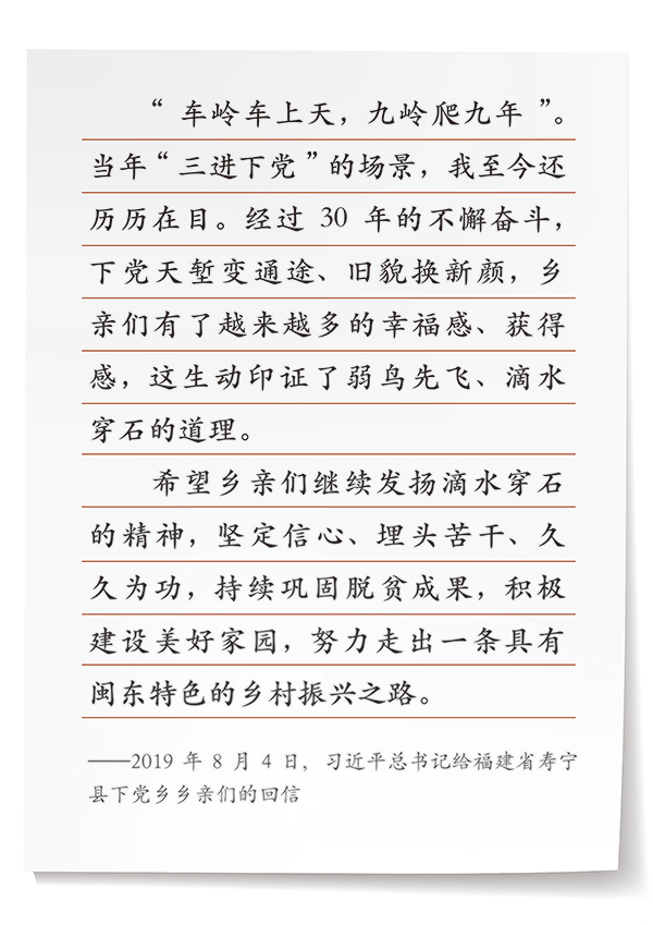 习近平总书记对民生福祉念兹在兹。2019年8月4日,习近平总书记给福建省宁德市寿宁县下党乡的乡亲们回信,祝贺他们实现脱贫,鼓励他们发扬滴水穿石精神,走好乡村振兴之路。一封回信,句句真情,尽暖民心。