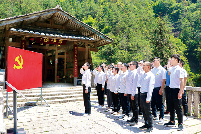 下党村的振兴发展,凝结着广大干部群众的智慧心血和不懈努力,有力见证了“滴水穿石、久久为功”的奋斗力量。图为党员干部在鸾峰桥前重温入党誓词。 吴文沁 摄