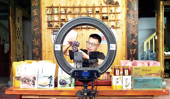 从茶叶、食用菌到金线莲,从餐饮、民宿到文创,下党村特色产业、文旅产业发展迅速。图为返乡创业青年在直播间介绍下党当地农产品。 周义 摄