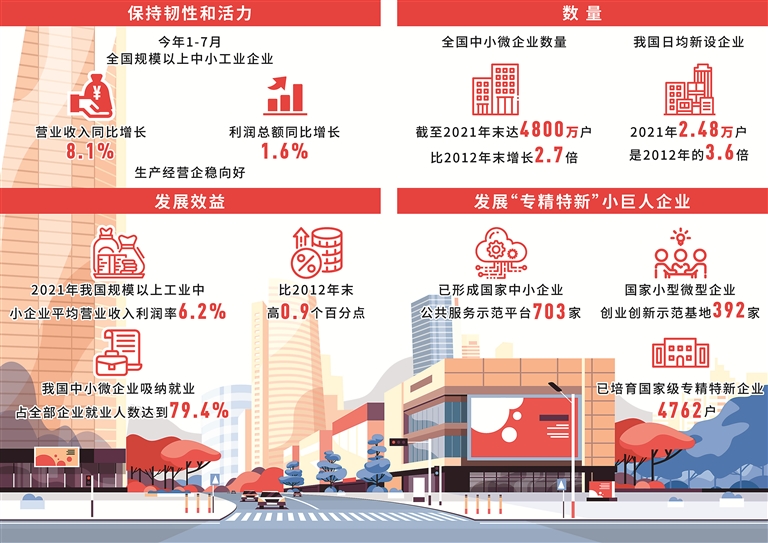 量大面广的中小企业是稳经济稳就业的重要力量。党的十八大以来,我国促进中小企业发展的政策体系、服务体系不断完善,发展环境不断优化,中小企业呈现又快又好的发展态势,对经济社会发展全局作出重要贡献。截至2021年末,全国中小微企业数量达4800万户,比2012年末增长2.7倍;2021年我国日均新设企业2.48万户,是2012年的3.6倍。2021年我国规模以上工业中小企业平均营业收入利润率6.2%,比2012年末提高0.9个百分点。第四次全国经济普查显示,我国中小微企业吸纳就业占全部企业就业人数达到79.4%。