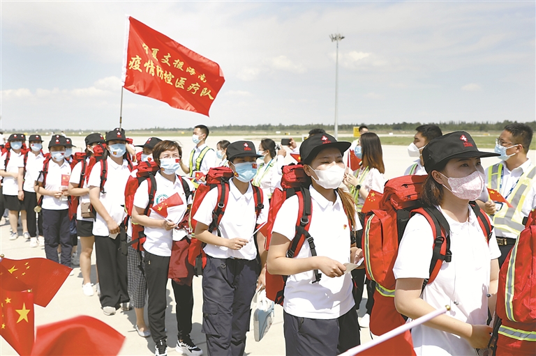 8月16日,504名宁夏支援海南疫情防控医疗队员白衣为甲、逆行出征,驰援海南。(图片来源:视觉中国)