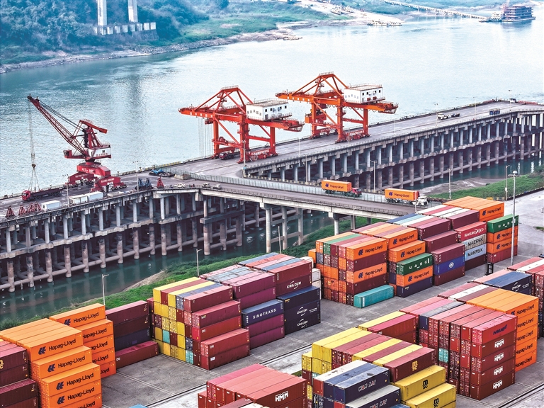 重庆两江新区果园港是长江内河上游首个智能水平运输与有人集卡智驭混行作业的港口。图为近日拍摄的果园港。 新华社记者 唐奕 摄