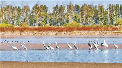 早年间,这里还是一片光秃秃的光板地、盐碱滩,生态环境非常脆弱。东营探索“黄河口湿地修复模式”,坚持保护优先、自然修复为主,科学组织生态补水,实施退耕还湿、退养还滩、互花米草治理、盐地碱蓬恢复等生态修复工程。在当地有关部门不懈努力下,才有了眼前这片水草丰茂、鱼鸟翔集的大美湿地。