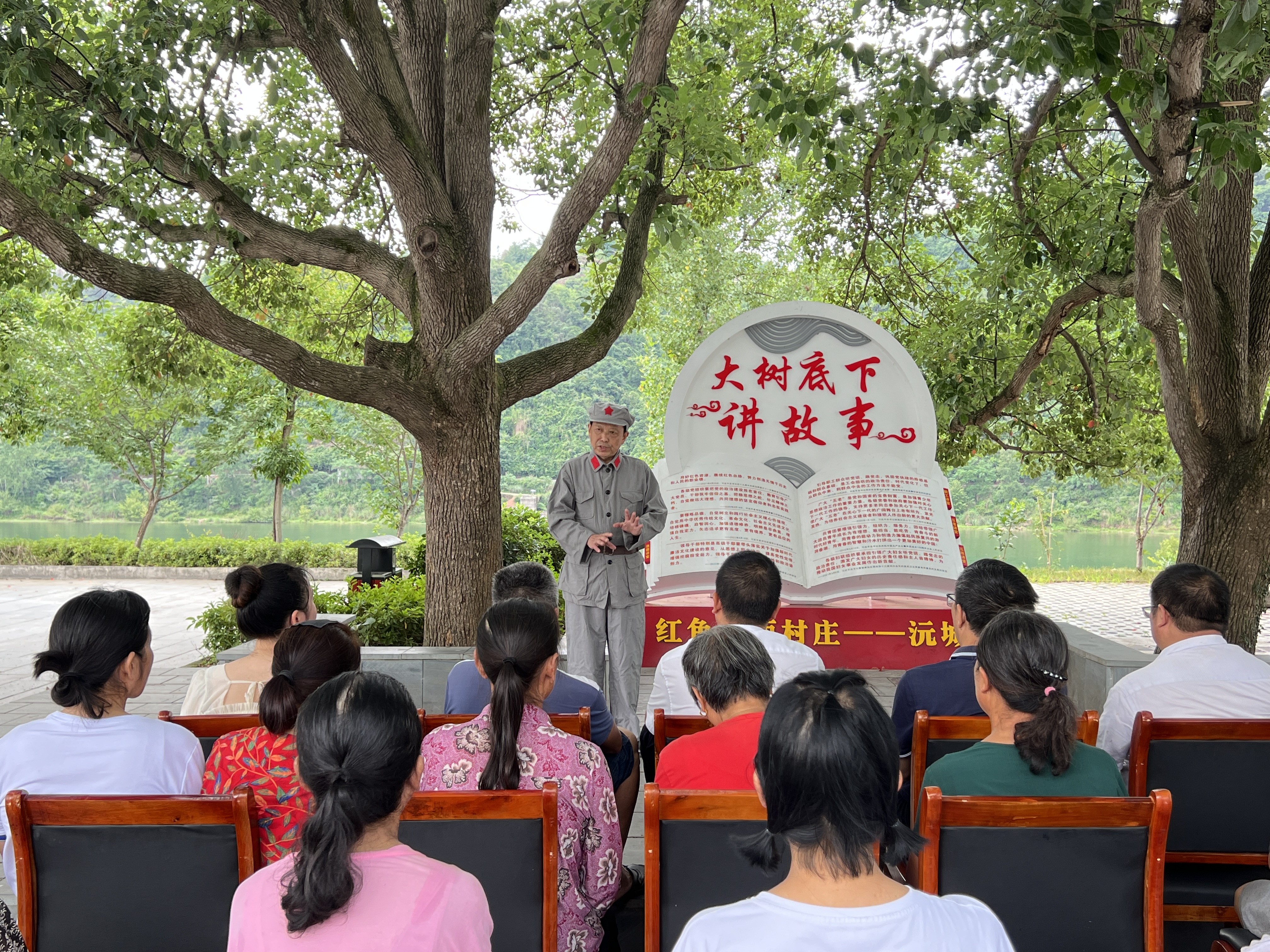 湖南省洪江市开展“大树底下讲故事”移风易俗育清廉宣传行动,在全市各乡镇打造活动阵地30余处,推动廉洁文化向群众身边延伸。图为该市沅河镇沅城村老党员在大树底下宣讲党的二十大精神。汤垒垒 摄
