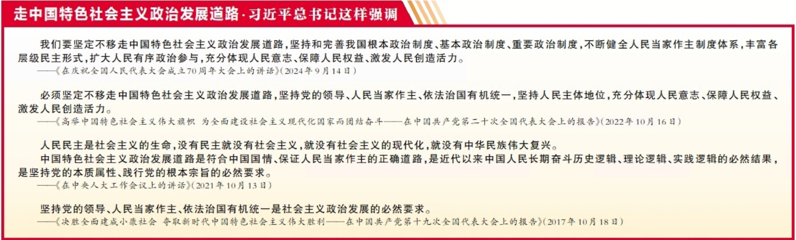 “十五五”规划建议明确部署,“坚定不移走中国特色社会主义政治发展道路,坚持党的领导、人民当家作主、依法治国有机统一,发展全过程人民民主,完善中国特色社会主义法治体系”。人民民主是中国共产党始终高扬的光辉旗帜。要坚定不移走中国特色社会主义政治发展道路,在坚持党的领导、人民当家作主、依法治国有机统一中推进社会主义民主政治建设,不断加强人民当家作主的制度保障,加快推进国家治理体系和治理能力现代化,充分调动人民的积极性、主动性、创造性,更加切实、更有成效地实施人民民主。