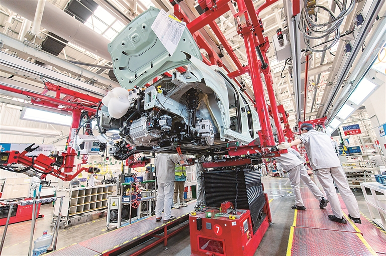 近年来,我国新能源、新材料、新能源汽车等绿色新兴产业快速成长,成为稳增长、扩就业的重要力量。图为浙江金华新能源汽车小镇某工厂车间里,工人正在装配新能源汽车。图片来源:视觉中国