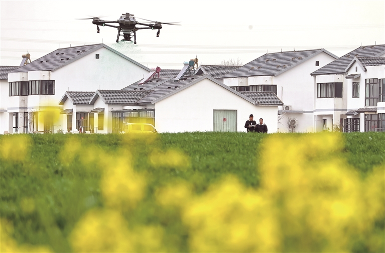 3月14日,江苏镇江,句容市茅山镇何庄村,农民操作植保无人机在麦田里施肥。无人机、麦田、花海与村落勾勒出一幅现代化农村春景图。图片来源:视觉中国