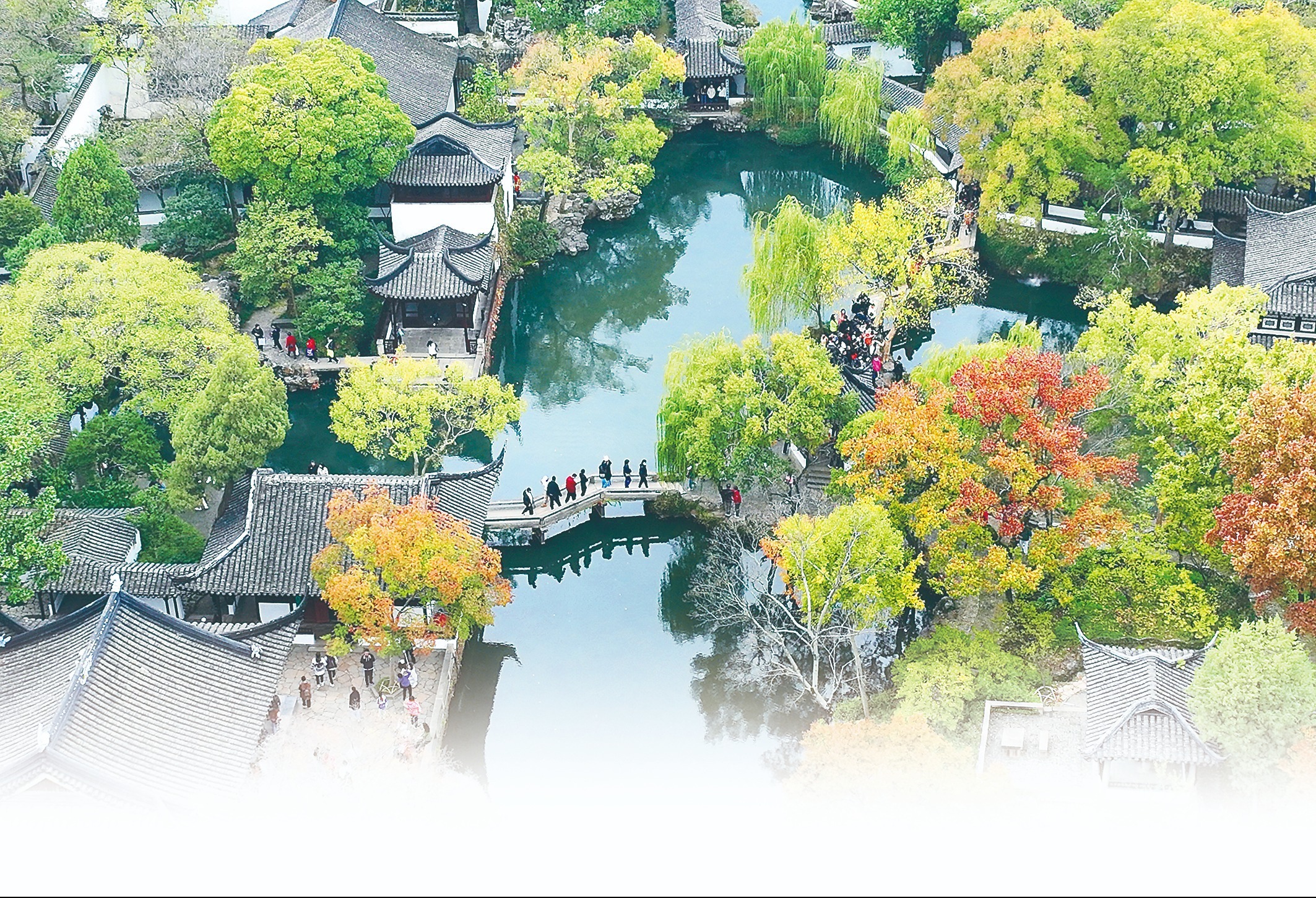11月12日,苏州拙政园内彩叶缤纷,古树名木与园林池塘、亭台楼阁等古典建筑交相辉映,吸引许多游客游园赏景。图片来源:视觉中国