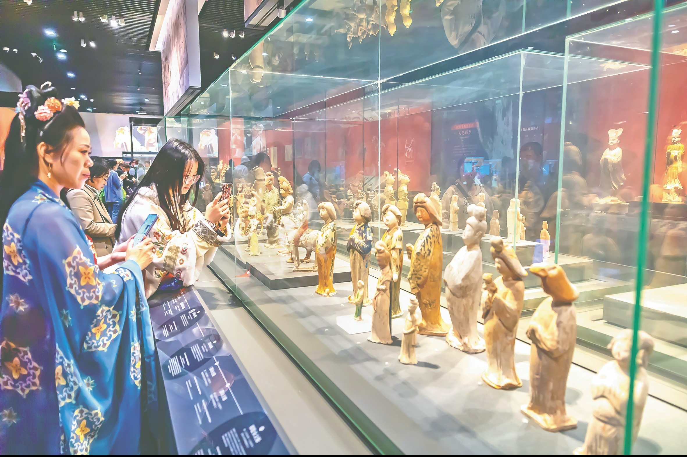 11月7日,陕西历史博物馆内,穿着汉服的游客在拍照观展。 图片来源:视觉中国