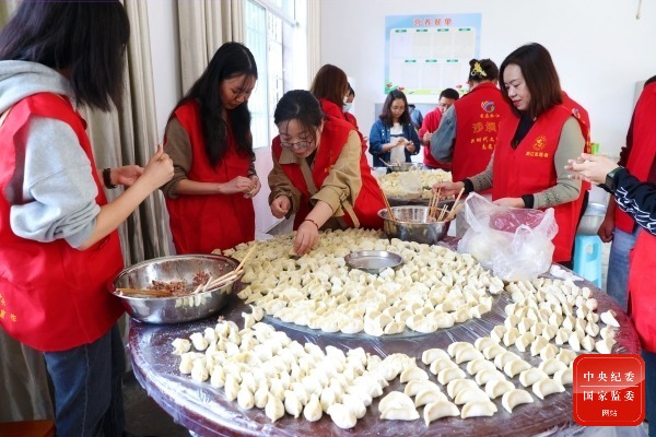 在重庆市黔江区沙坝镇木良村,志愿者们擀面皮、做馅料,为村里的老人包水饺,将温暖包进饺子里、将关心藏在话语中,让老人们体会满满的关怀与祝福。(重庆市黔江区纪委监委供 杨敏 摄)