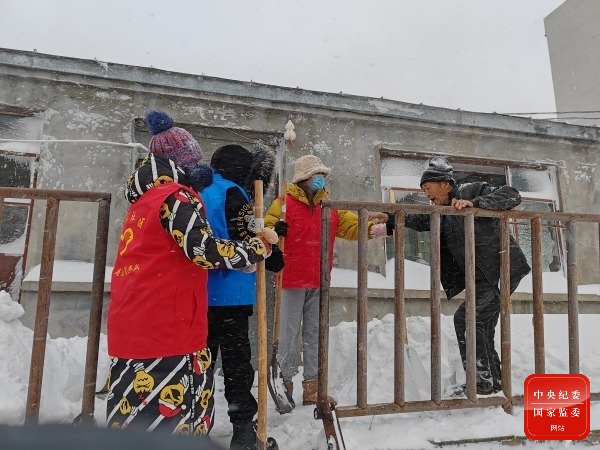 入冬以来,一场罕见的暴风雪突袭黑龙江省抚远市,背风巷道积雪寸步难行,部分独居老人被堵在家中,面对这种困境,临江社区志愿者服务队积极开展“清扫积雪 寒冬送暖”活动。图为近日,临江社区志愿者服务队深入种子公司东侧平房姜凤山老人家清理院里积雪。(黑龙江省抚远市纪委监委供 运崇会 摄)