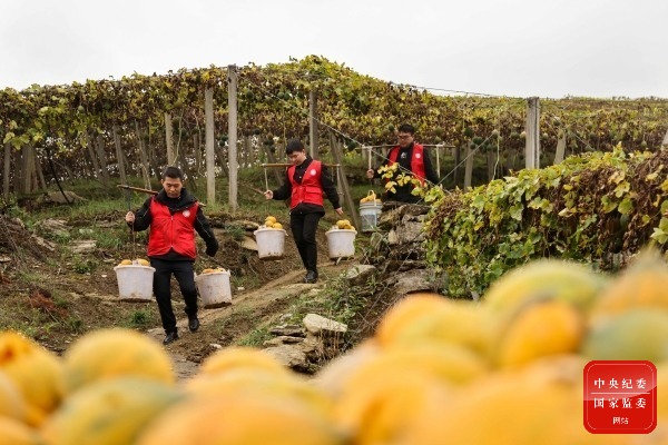 农忙时节,贵州省遵义市新蒲新区党员干部志愿服务队深入田间地头,帮助农户采摘、搬运瓜蒌,用实际行动践行志愿服务精神。(贵州省遵义市新蒲新区纪检监察工委供 简垦 摄)