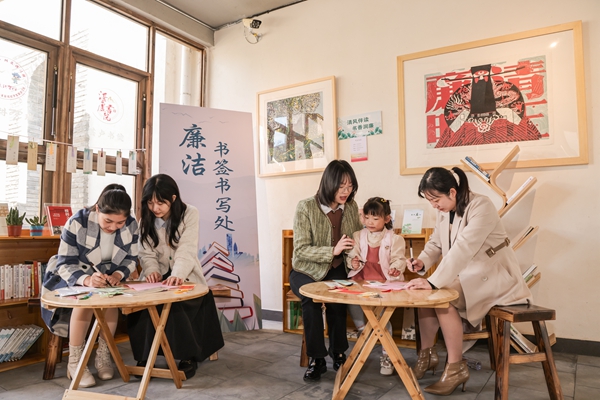福建省松溪县纪委监委将党员干部家庭家教家风建设作为重要抓手,以刚性监督与柔性教育相结合,推动党风政风与社风民风互促共进。图为该县女纪检监察干部在河东乡大布村清风读书角,同党员干部家属共写廉洁书签。(福建省松溪县纪委监委 陈炊 摄)