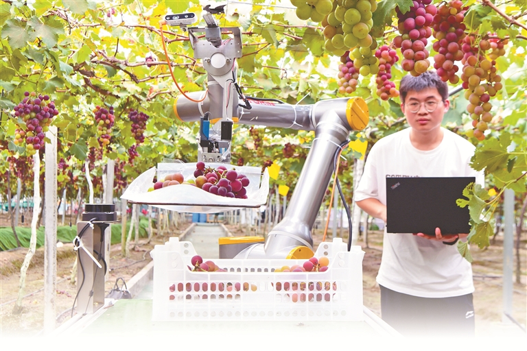 浙江省金华市浦江县靓松家庭农场葡萄园里,软件工程师正在调试、操作智慧葡萄采摘机器人。