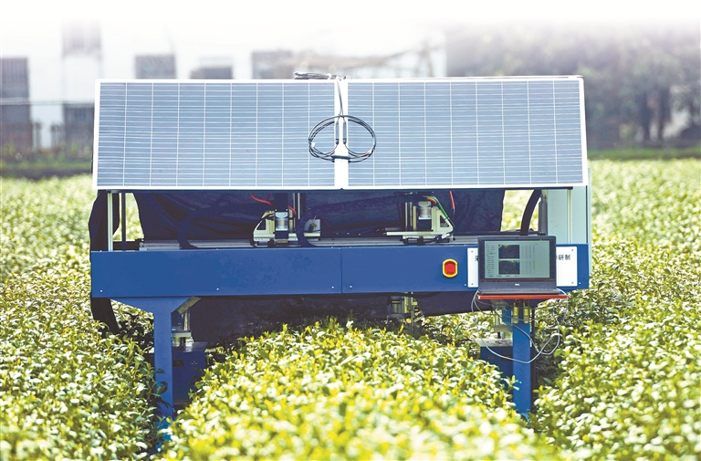 浙江省杭州市,智能采茶机器人在茶园里采摘茶叶的嫩芽。 图片来源:视觉中国