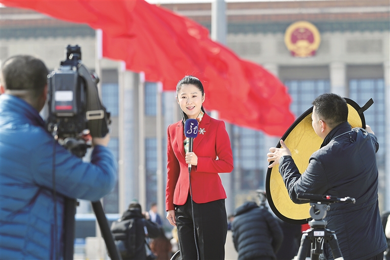 坚持团结稳定鼓劲、正面宣传为主,才能唱响主旋律,传播正能量,不断巩固和壮大主流思想舆论,弘扬社会主义核心价值观,为培育积极理性社会心态、促进社会和谐稳定提供精神养料。图为今年全国两会期间,媒体记者在人民大会堂外进行报道。图片来源:视觉中国