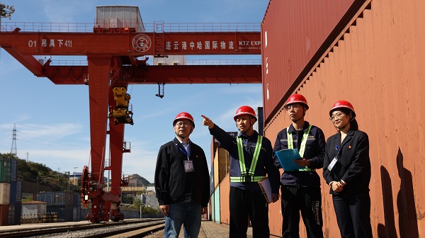 江苏省连云港市纪委监委围绕“一带一路”重大决策部署强化政治监督,排定26项重点监督任务,开展“一带一路”标杆示范项目专项监督,为重点项目高质量发展保驾护航。图为该市纪检监察干部在中哈(连云港)物流合作基地调研国际班列通道建设工作。苏勋杰 摄