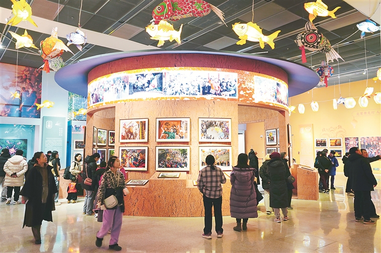 中国式现代化既要物质财富极大丰富,也要精神财富极大丰富、在思想文化上自信自强。 图为观众在中国非物质文化遗产馆内参观 “过年——春节主题摄影展”。透过画面,观众能看到非物质文化遗产在当代的活态传承,感受春节文化中“天人合一”“和合共生”的古老智慧。 图片来源:视觉中国