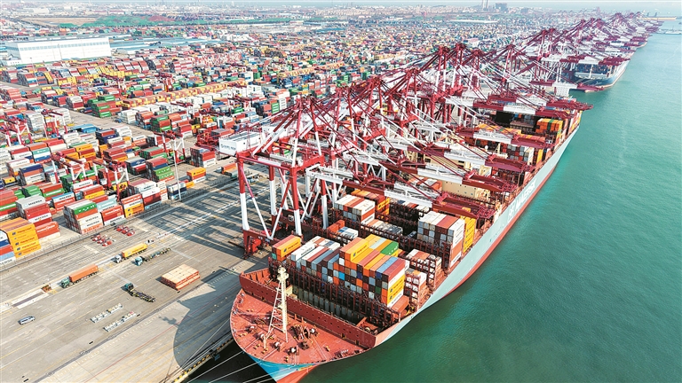 中国坚定不移推进高水平对外开放,为世界经济增长贡献强大稳定锚。海关总署发布的数据显示,今年前2个月,中国货物贸易进出口总值7.73万亿元,同比增长18.3%。图为近日,在山东港口青岛港,外贸集装箱码头作业一派繁忙。新华社发(俞方平 摄)