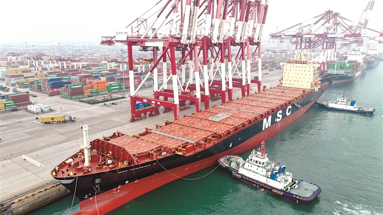 1月4日,澳洲直航新航线首班船舶靠泊山东港口青岛港,标志着该港2026年首条外贸新航线正式开通。图为澳洲直航新航线首班船舶——“地中海杰西尼亚”轮靠泊山东港口青岛港。新华社发(张进刚 摄)