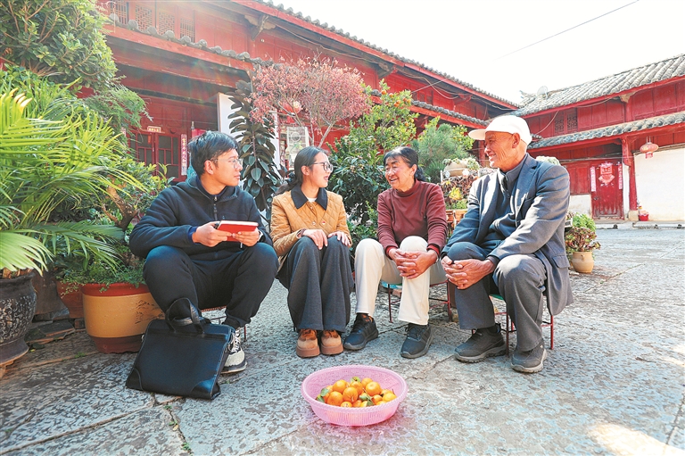 云南省陆良县纪委监委聚焦各项惠民政策落地见效,组织纪检监察干部下沉一线走访调研,倾听群众诉求,坚决纠治惠民政策落实打折扣、漠视侵害群众利益等突出问题,以精准监督守护民生福祉,让发展成果更多更公平惠及人民群众。图为近日,陆良县纪检监察干部在马街镇良迪村了解养老金发放、村组干部作风等情况。王勇 摄