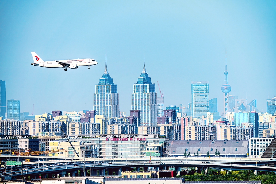 新时代十年,我国一些关键核心技术实现突破,战略性新兴产业发展壮大,载人航天、超级计算机、卫星导航、大飞机制造、生物医药等取得重大成果,进入创新型国家行列。图为5月28日,上海,从北京飞回的C919国产大飞机与上海地标东方明珠、环球港同框。图片来源:视觉中国