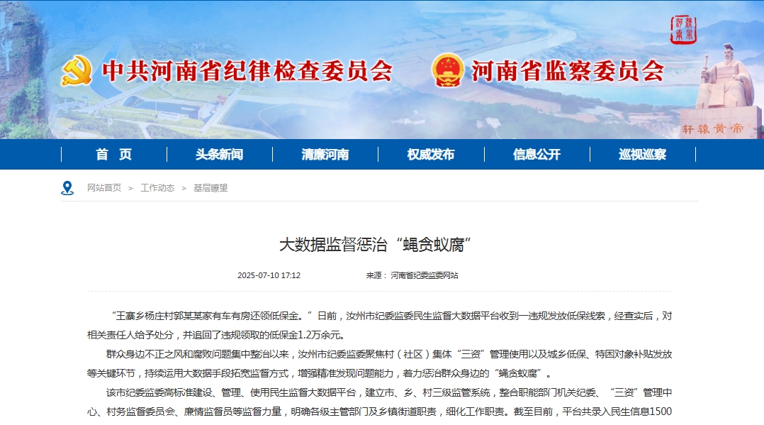 该市纪委监委高标准建设、管理、使用民生监督大数据平台,建立市、乡、村三级监管系统,整合职能部门机关纪委、“三资”管理中心、村务监督委员会、廉情监督员等监督力量,明确各级主管部门及乡镇街道职责,细化工作职责。截至目前,平台共录入民生信息1500万余条,安装查询一体机25台,实现市区和21个乡镇(街道)全覆盖。“汝州市民生监督平台”微信公众号使用人数达36万余人,群众随时随地、足不出户就能查询监督。通过大数据碰撞、比对、查实,追缴违纪资金14.6万余元,处理处分83人。