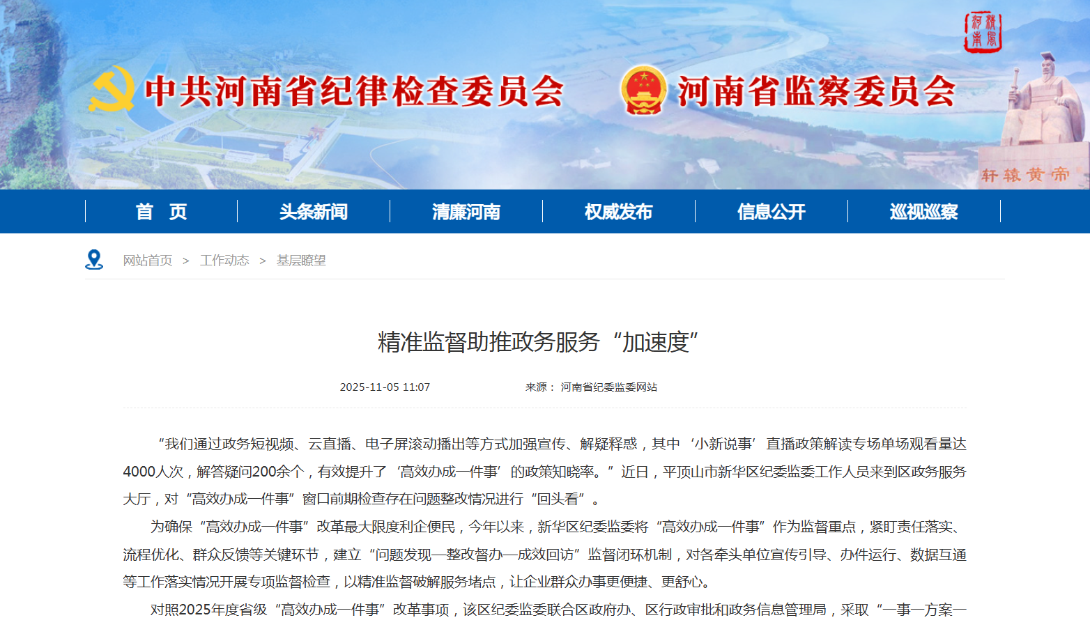 为确保“高效办成一件事”改革最大限度利企便民,今年以来,新华区纪委监委将“高效办成一件事”作为监督重点,紧盯责任落实、流程优化、群众反馈等关键环节,建立“问题发现—整改督办—成效回访”监督闭环机制,对各牵头单位宣传引导、办件运行、数据互通等工作落实情况开展专项监督检查,以精准监督破解服务堵点,让企业群众办事更便捷、更舒心。