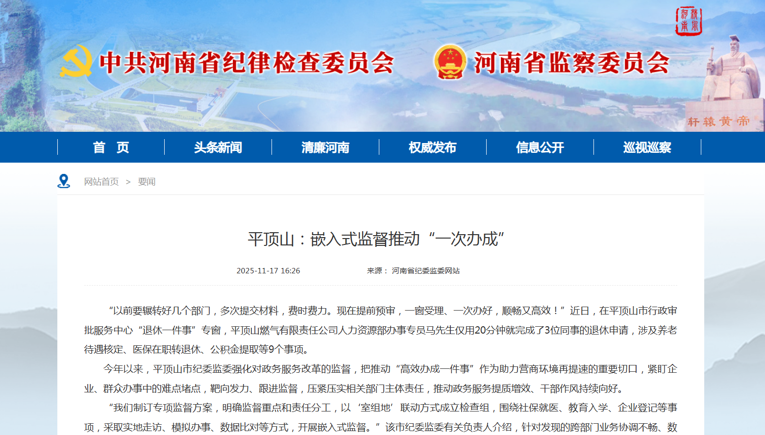 责任下沉、作风转变只是阶段目标,推动整改、促进治理才是最终目的。在纪检监察部门的监督推动下,平顶山市相关职能部门建立“一次采集、一网申报、并联审批”服务模式,退休、残疾人服务等38个“高效办成一件事”改革任务陆续完成,平均办理时限压缩43.6%,企业、群众办事便利度、满意度全面提升。(蔡文瑶 陈灿灿)