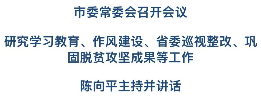 9月5日,市委常委会召开会议,传达学习习近平总书记近期系列重要讲话和重要指示精神,研究学习教育、作风建设、省委巡视整改、巩固脱贫攻坚成果等工作。市委书记陈向平主持会议并讲话,市委副书记王如厂出席,市人大常委会主任张明新、市政协主席黄庚倜列席。