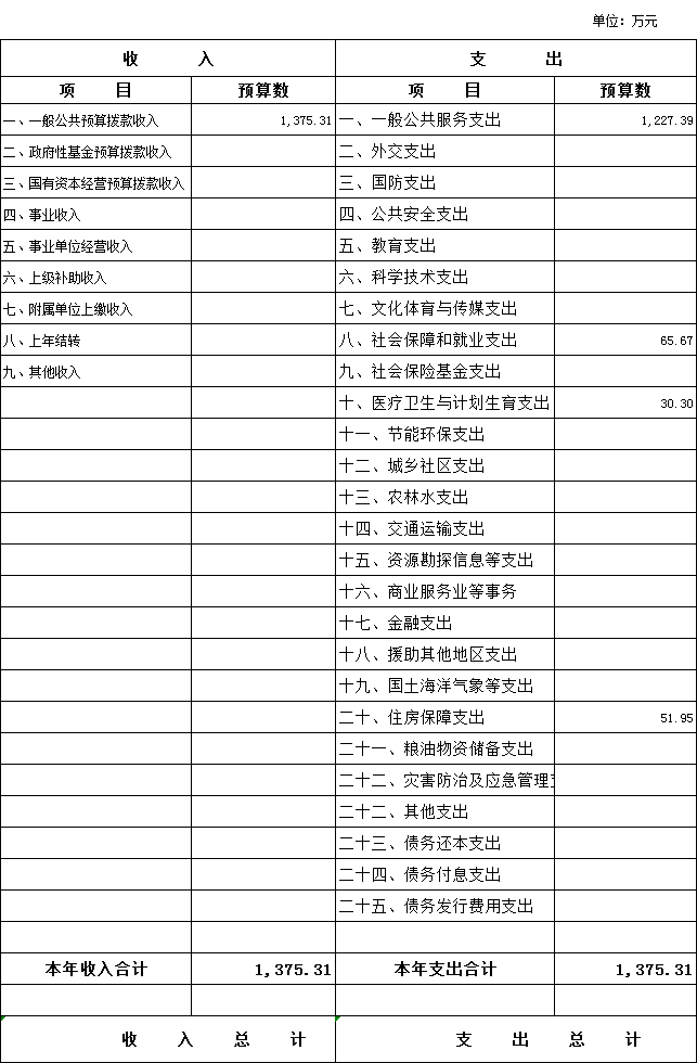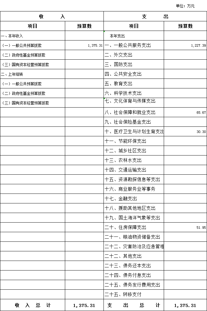2020年一般公共预算支出年初预算为1375.31万元。主要用于以下方面:一般公共服务(类)支出1227.39万元,占89.24%;社会保障和就业(类)支出65.67万元,占4.77%;医疗卫生(类)支出30.30万元,占2.20%;住房保障(类)支出51.95万元,占3.78%.