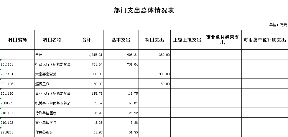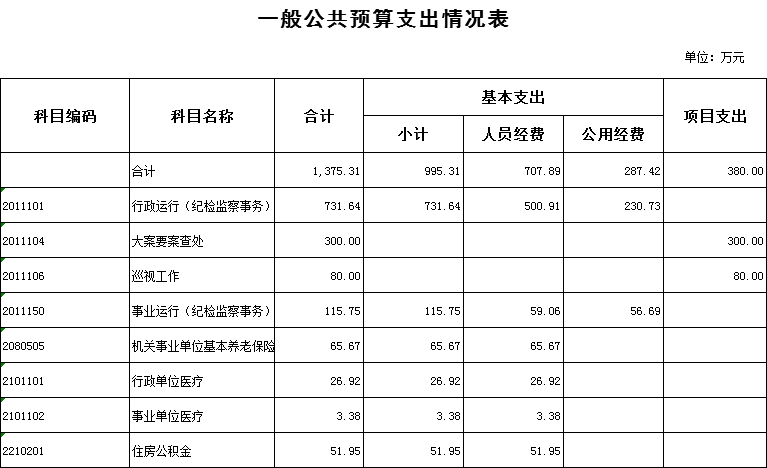 2020年收、支总计均为1375.31万元,与2019年相比,收、支总计均增加449.71万元。主要原因:一是人员增加,二是案件查办力度加大,差旅费、公车运行维护费增加。