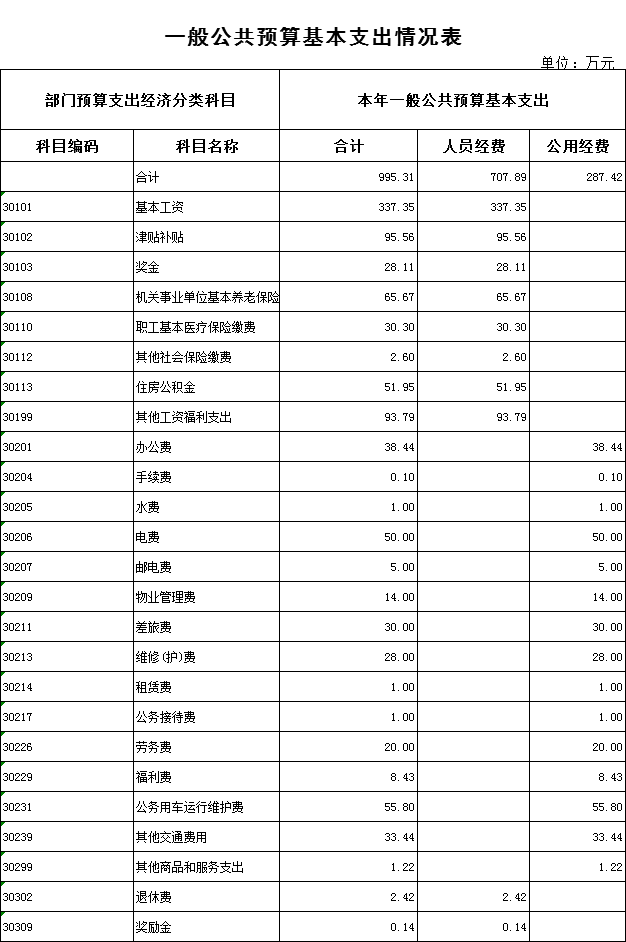 2020年预算支出1375.31万元,其中:基本支出995.31万元,主要包括:基本工资、津贴补贴、奖金、绩效工资、机关事业单位基本养老保险缴费、职业年金缴费、医疗保险缴费、其他社会保障缴费、住房公积金、其他工资福利支出、退休费、其他对个人和家庭的补助支出;项目支出380万元,主要包括:办公费、印刷费、邮电费、差旅费、维修(护)费、租赁费、会议费、培训费、公务接待费、劳务费、福利费、公务用车运行维护费、其他交通费用、其他商品和服务支出、办公设备购置、信息网络及软件购置更新和其他支出。