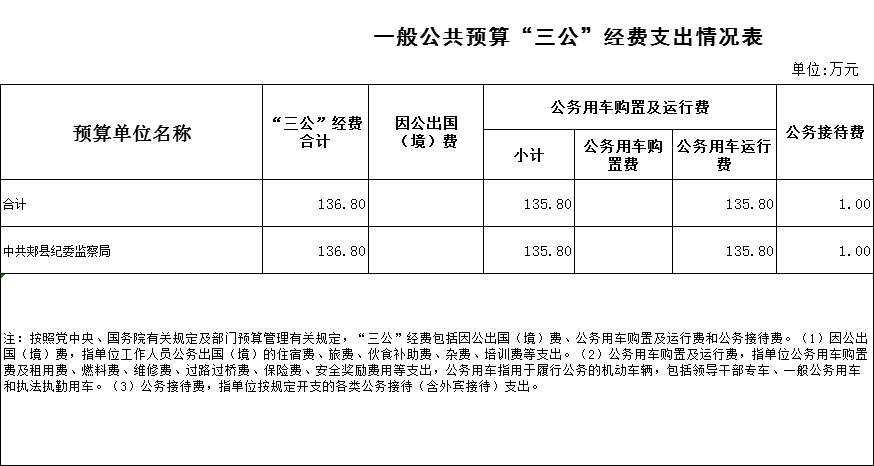 七、“三公”经费:是指纳入县级财政预算管理,部门使用财政拨款安排的因公出国(境)费、公务用车购置及运行费和公务接待费。其中,因公出国(境)费反映单位公务出国(境)的住宿费、旅费、伙食补助费、杂费、培训费等支出;公务用车购置及运行费反映单位公务用车购置费及租用费、燃料费、维修费、过路过桥费、保险费、安全奖励费用等支出;公务接待费反映单位按规定开支的各类公务接待(含外宾接待)支出。