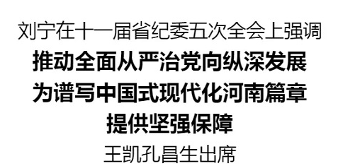 1月14日,十一届省纪委五次全会在郑州召开。省委书记刘宁出席并讲话,强调要全面贯彻落实党的二十大和二十届二中、三中全会精神,深入贯彻二十届中央纪委四次全会精神,学习领会习近平总书记关于党的自我革命重要思想和关于河南工作的重要讲话重要指示批示精神,始终保持反腐败永远在路上的坚韧执着,增强战略定力,强化高压态势,推动全面从严治党向纵深发展,为谱写新时代中原更加出彩的绚丽篇章提供坚强保障。省长王凯、省政协主席孔昌生出席会议。中央纪委国家监委有关同志到会指导。
