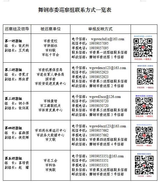 本轮现场巡察时间2023年12月1日至2024年1月26日。巡察期间,市委各巡察组均设置专门信访窗口,开通值班电话、接收短信手机、电子邮箱、邮政信箱、信访举报二维码等渠道,主要受理反映被巡察单位领导班子及其成员、其他科级干部、内设科室和二级机构负责人的来信来电来访。对个人诉求、涉法涉诉等不属于巡察受理范围的信访问题反映,将按规定移交相关部门处理。巡察期间,市委巡察组将严格落实中央八项规定及其实施细则精神和省委、平顶山市委和舞钢市委相关规定,主动接受被巡察单位和社会各界的监督,市纪委监委监督举报电话0375—7281771,市委组织部监督举报电话12380,市委巡察办监督举报电话:0375—7281075。