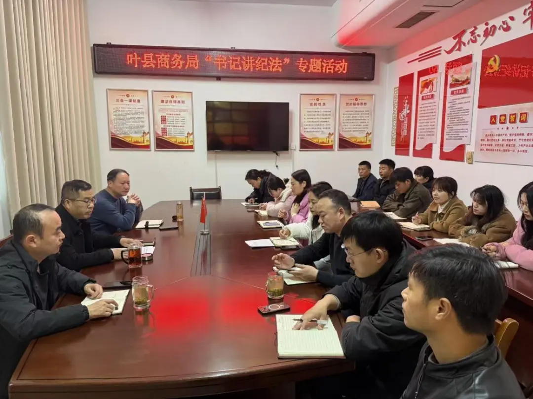 为深入贯彻新时代全面从严治党要求,以严明纪律作风护航全县商务经济高质量发展,确保2026年工作开好局、起好步,近日,叶县商务局开展“书记讲纪法”廉政专题党课活动。局党组书记、局长王彦林以“严明纪律守底线,干在实处促发展,为2026年开好局起好步提供坚强纪律保障” 为主题,为机关全体党员干部授课。