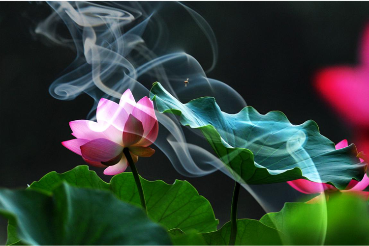 烟雾缭绕如仙境,荷花醉人胜仙子。(黄守胜)