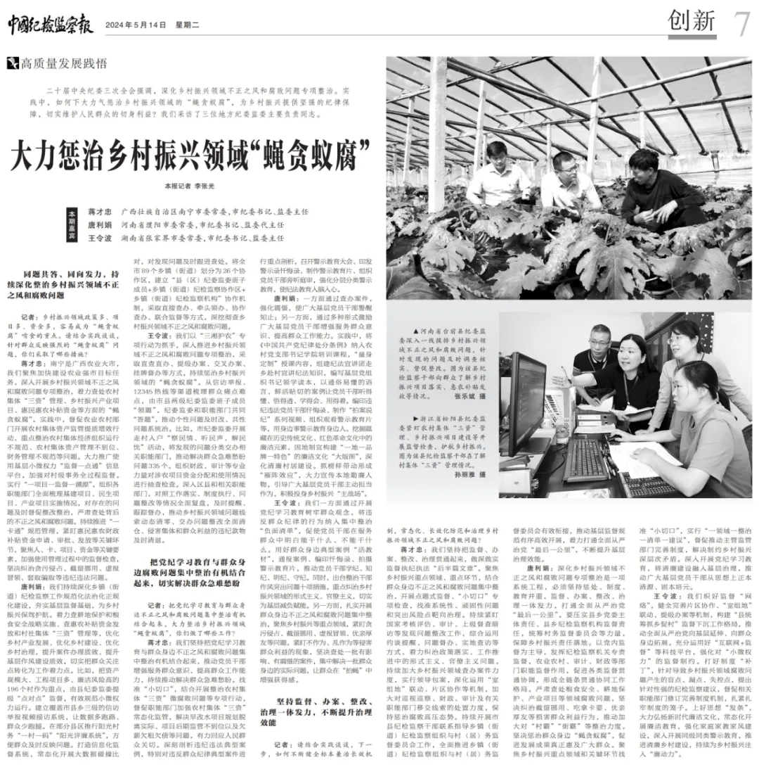蒋才忠:南宁是广西农业大市,我们聚焦加快建设农业强市目标任务,深入开展乡村振兴领域不正之风和腐败问题专项整治,着力查处农村集体“三资”管理、乡村振兴产业项目、惠民惠农补贴资金等方面的“蝇贪蚁腐”。实践中,督促农业农村部门开展农村集体资产监管提质增效行动,重点整治农村集体经济组织运行不规范、农村集体资产管理不到位、财务管理不规范等问题。大力推广使用基层小微权力“监督一点通”信息平台,加强对村级事务全过程监督。实行“一项目一监督一溯源”,组织各职能部门全面梳理基建项目、民生项目、产业项目实施情况,对存在的问题及时督促整改整治,严肃查处背后的不正之风和腐败问题。持续推进“一卡通”规范管理,紧盯惠民惠农财政补贴资金申请、审批、发放等关键环节,聚焦人、卡、项目、资金等关键要素,加强使用管理过程中的监督检查,坚决纠治贪污侵占、截留挪用、虚报冒领、套取骗取等违纪违法问题。