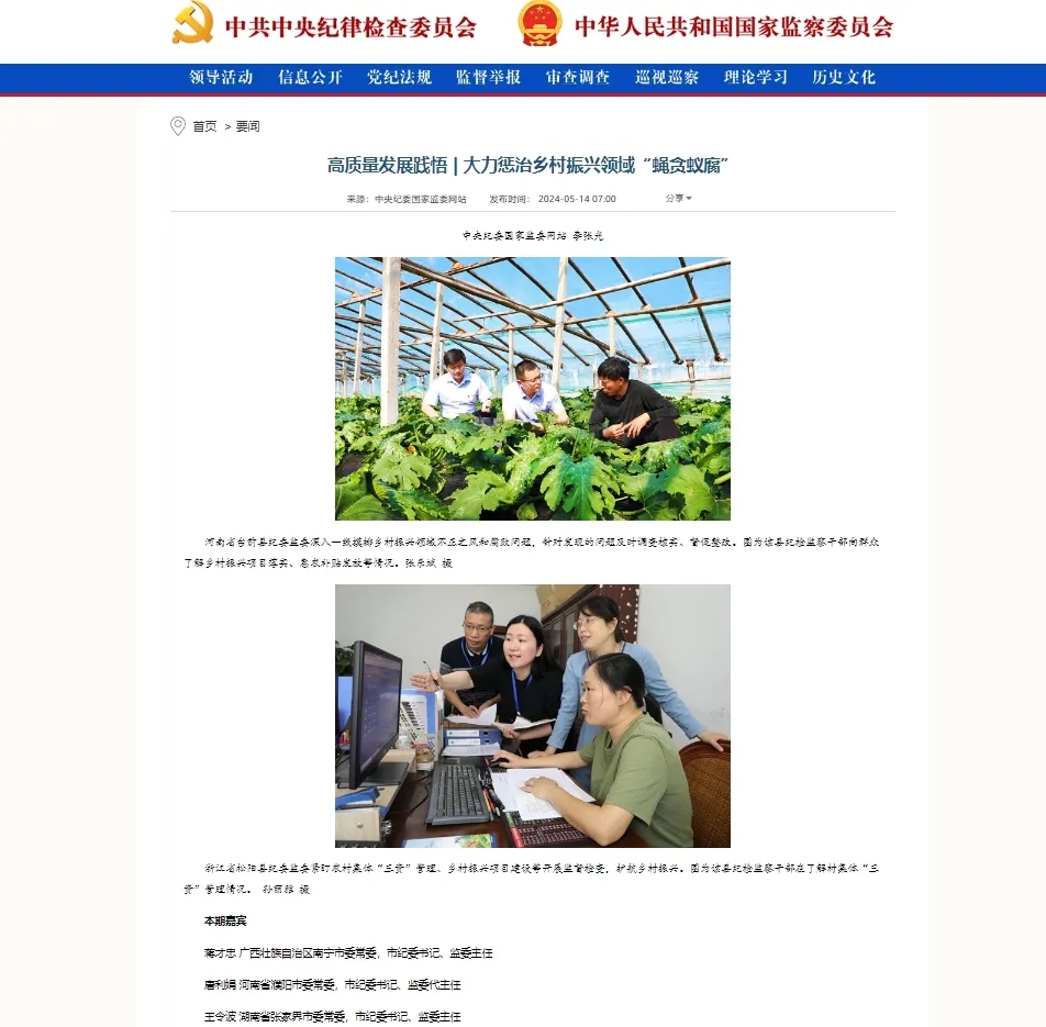 唐利娟:深化乡村振兴领域不正之风和腐败问题专项整治是一项系统工程,必须坚持惩处、制度、教育并重,监督、办案、整改、治理一体发力,打通全面从严治党“最后一公里”。要压实县乡党委主体责任、县乡纪检监察机构监督责任,统筹村务监督委员会等力量,保障乡村振兴责任落地。以党内监督为主导,发挥纪检监察机关专责监督,农业农村、审计、财政等部门职能监督作用,促进各类监督贯通协调,形成全链条贯通协同工作格局。严肃查处粮食安全、耕地保护、产业项目等领域腐败问题,坚决纠治截留挪用、吃拿卡要、优亲厚友等损害群众利益行为,推动加大对“村霸”“街霸”等整治力度,坚决惩治群众身边“蝇贪蚁腐”,促进发展成果真正惠及广大群众。聚焦乡村振兴重点领域和关键环节找准“小切口”,实行“一领域一整治一清单一建议”,督促推动主管监管部门完善制度,解决制约乡村振兴深层次矛盾。深入开展党纪学习教育,将清廉建设融入基层治理,推动广大基层党员干部从思想上正本清源、固本培元。
