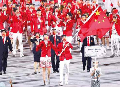 北京时间7月23日晚7时,第32届夏季奥运会开幕式在东京新国立竞技场拉开帷幕。8时45分许,第110位登场的中国体育代表团踏着坚定的步伐进入场内,一抹“中国红”在现场灯光的映衬下显得气势非凡。面对这场体育战线在“两个一百年”奋斗目标历史交汇点的大仗大考,“全力拼搏、为国争光”的誓言激励着代表团中的每一位选手。