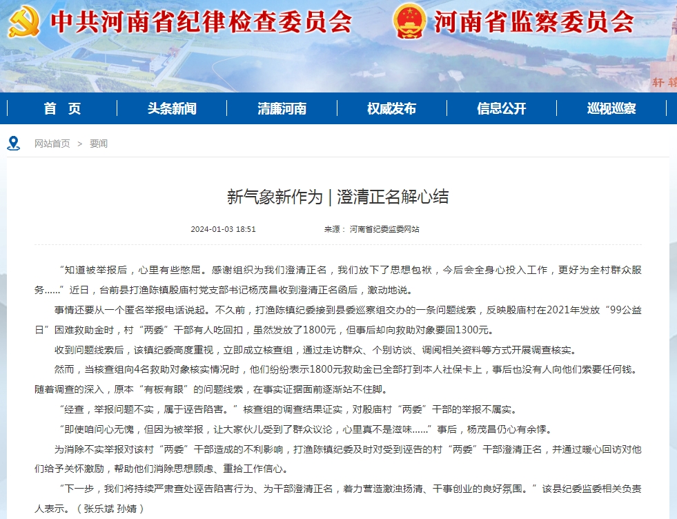 “知道被举报后,心里有些憋屈。感谢组织为我们澄清正名,我们放下了思想包袱,今后会全身心投入工作,更好为全村群众服务……”近日,台前县打渔陈镇殷庙村党支部书记杨茂昌收到澄清正名函后,激动地说。