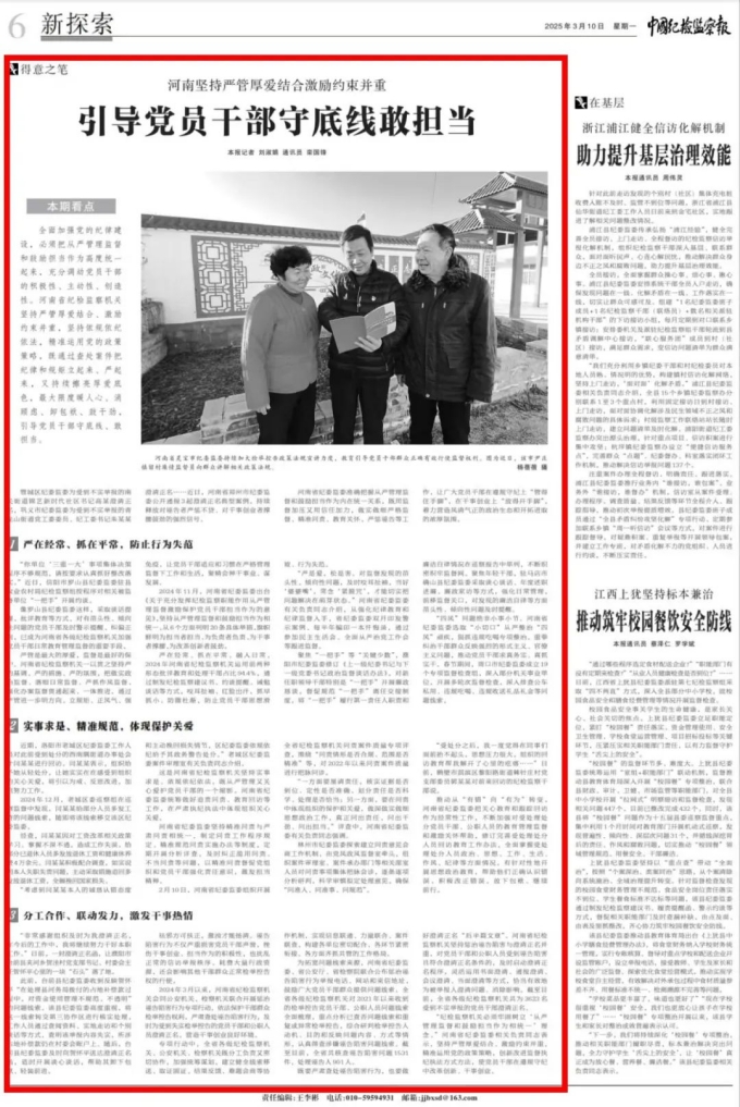 3月10日,中国纪检监察报专版刊发《河南坚持严管厚爱结合激励约束并重 引导党员干部守底线敢担当》,报道河南纪检监察机关准确把握从严管理监督和鼓励担当作为内在统一关系,做实做细严格监督、精准问责、教育关怀、严惩诬告等工作,严在经常、抓在平常,防止行为失范,实事求是、精准规范,体现保护关爱,分工合作、联动发力,激发干事热情,着力营造风清气正的政治生态和开拓进取的浓厚氛围的生动实践。