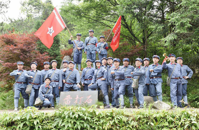 风党纪教育活动。图为党员干部在毛泽东宣布三大纪律遗址—荆竹山雷打石合影。
