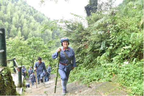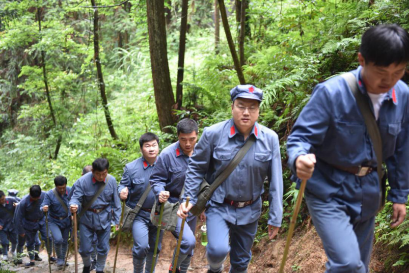 在重走朱毛挑粮小道活动中,学员们统一身穿红军装,头戴红军帽走向密林,踏上了蜿蜒曲折、崎岖不平的挑粮小道。沿着狭窄的小道,学员们拾级而上,悉心体会当年的艰辛,更体会到了红军那坚定的理想信念,火热的革命激情。随着山势的变化,再加上雾气跟长时间的降雨,原本布满苔藓、泥土的山路。挑粮小道也愈发难行,学员们气喘吁吁,脚步也变得越来越沉重,衣服都被汗水所浸透,但学员们相互鼓励,相互帮助,用当年红军战士顽强的斗志、奉献的精神和必胜的信念,鞭策自己咬紧牙关一步步向终点攀登,最终全体学员顺利到达终点。